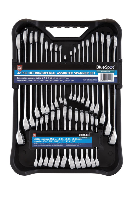 The BlueSpot 32 PCE Metric/Imperial Assorted Spanner Set is manufactured from chrome vanadium, heat-treated and nickel-plated for increased durabil...