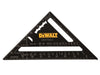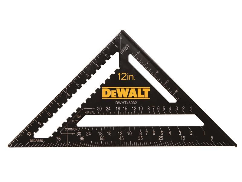 The DEWALT Rafter Layout Square has an extra-thick, extruded aluminium body that holds up to heavy-duty use, ideal for use as saw guide. With stamped-in contrasting colour graduations for better readability. The fixed large base helps provide better grip on materials. It also features scribe line notches for marking rip cuts. Easy to use, a pivot point makes marking out angles easy. With scales of top cuts; common jack rafters, hip and valley rafters for versatility.