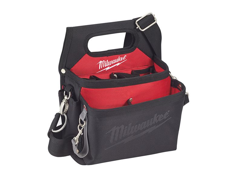 The Milwaukee Electrician's Pouch has a robust construction, made from 1680D ballistic nylon, double stitched with stronger riveted seams. The integrated handle allows easy transport and provides an easy mounting point on common job site materials. The pouch has a solid base that allows it to stand-up, even when fully loaded.