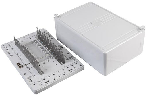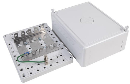 Plastic modular box, designed to accommodate up to 5 LSA-PLUS® 10 pair modules. Complete with removable side and end panels with cable knockouts.Co...