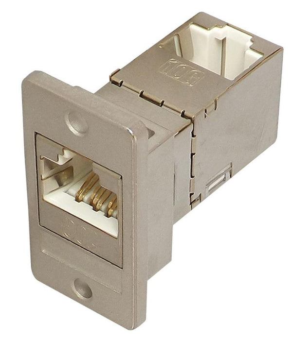 Shielded Cat6a Female to Female Panel Mount Coupler, Silver - Rear Outlet 90° to Front Outlet